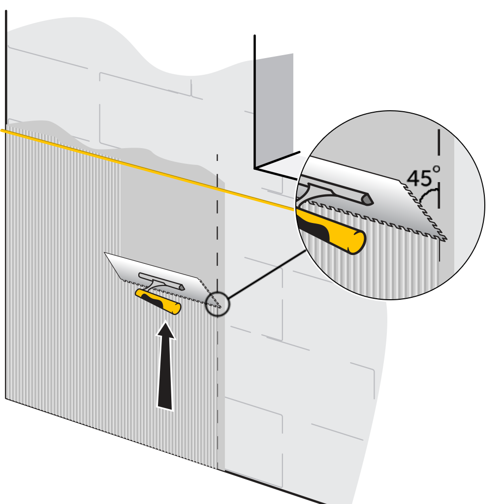 Verwenden Sie eine Zahnkelle mit 6 mm Zahnung, um den Kleber gleichmäßig in eine Richtung zu verteilen. Dadurch entstehen Rillen, die die Haftung verbessern.