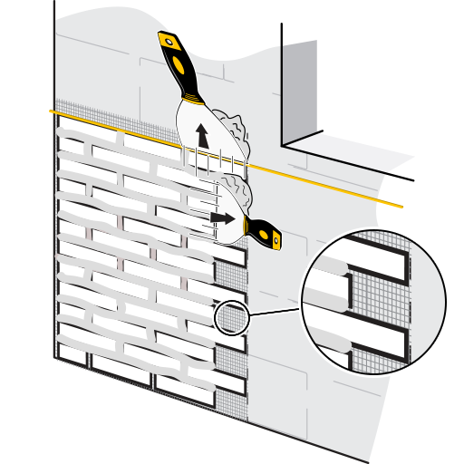 Tragen Sie zuerst eine dünne Schicht Kleber mit einer glatten Kelle auf die Wand auf, die jeweils eine AMK-Matte abdeckt.