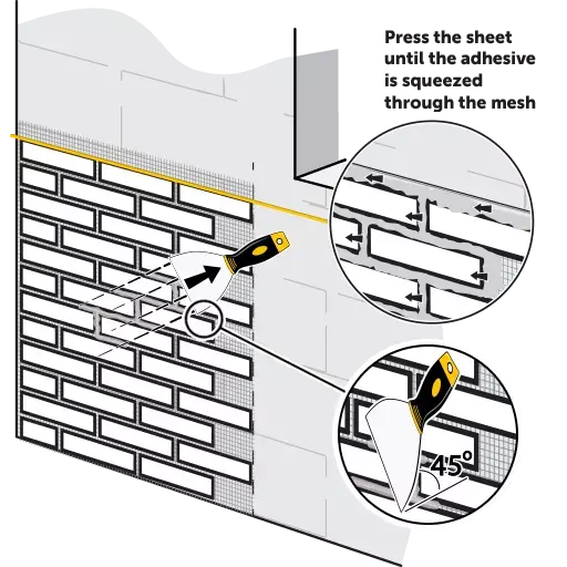 Tragen Sie zuerst eine dünne Schicht Kleber mit einer glatten Kelle auf die Wand auf, die jeweils eine AMK-Matte abdeckt.